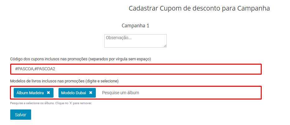 - Atribua este cupom a "fotolivros" escolhendo o modelo "Álbum para Cupons"