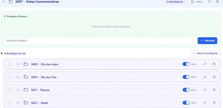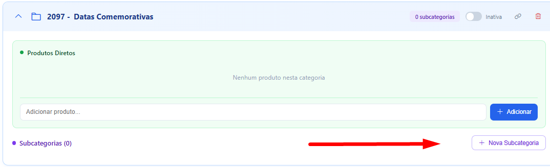 Dentro de uma categoria já existente, clique em "Nova Subcategoria" e siga o mesmo processo acima.