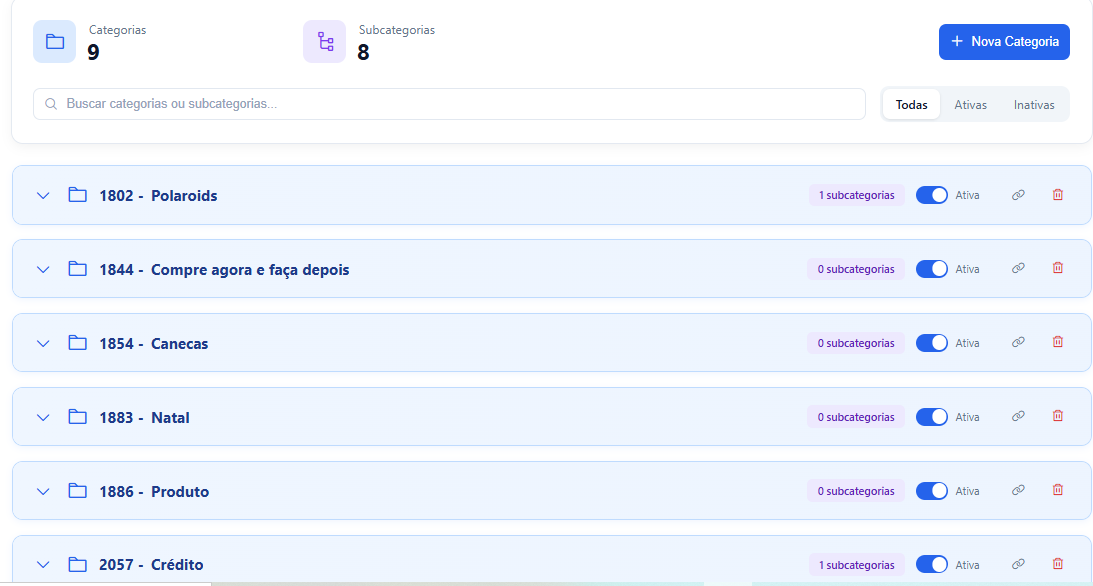 ⚠️ Ao excluir uma categoria, as subcategorias também são removidas. Os produtos não são apagados da loja.