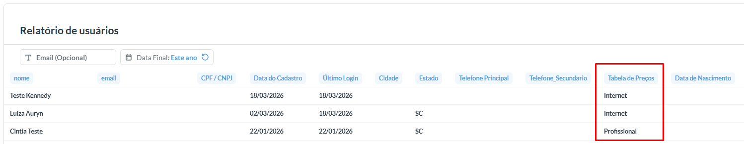 Qual tabela de preço está atribuída a cada usuário;