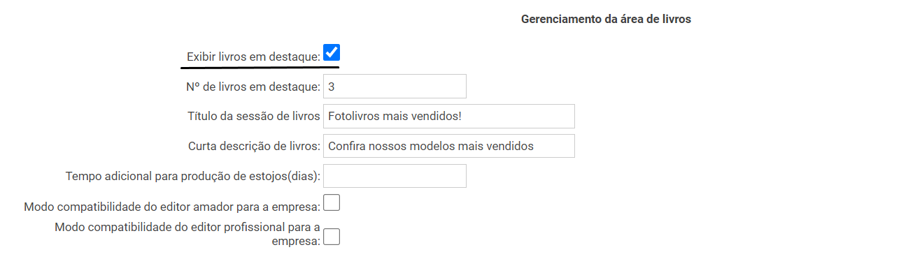 Edite também o "Título da sessão de livros" e a "Curta descrição de livros" que são os textos que aparecerão na sessão de destaque na home page.