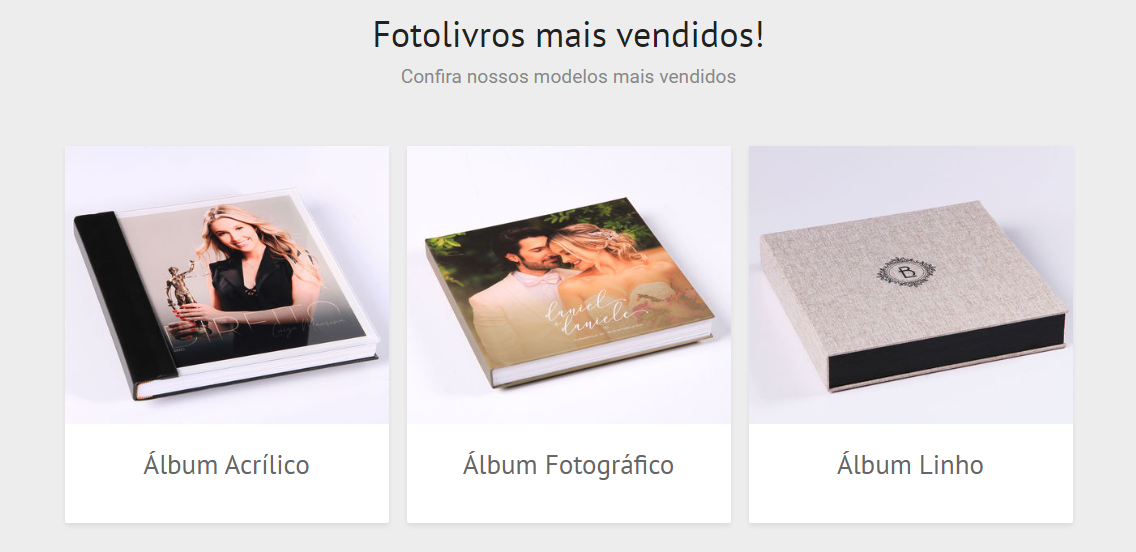 Outro detalhe importante é verificar a "Descrição pequena", que pode ser configurada individualmente por álbum no menu Módulos > Fotolivros > Gerenciar modelos e tamanhos. Será esta a descrição que aparecerá abaixo dos modelos em destaque na home.