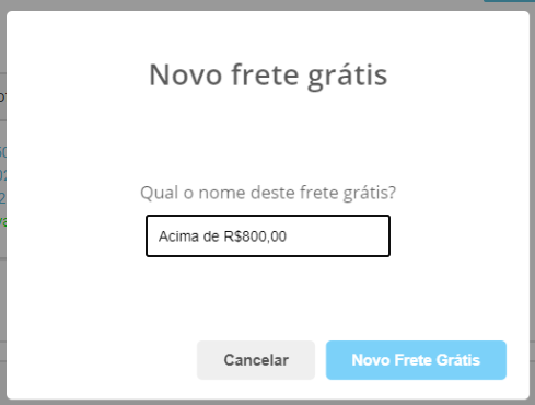 Preencha o nome do frete (Exemplo: Acima de R$800,00) e clique em "Novo frete grátis":