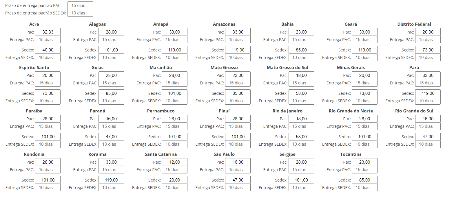 O sistema já mostrará valores sugeridos para cada Estado, e também de prazo de entrega para PAC e Sedex.