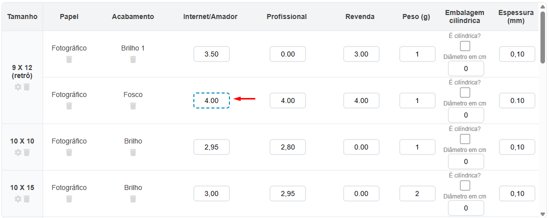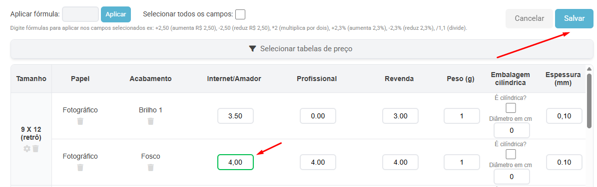 4. Basta digitar o valor desejado no campo (Ex.: 4,00) e "salvar" depois é só seguir para o próximo tamanho.