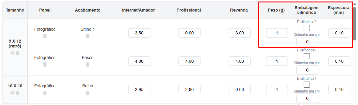 - Definir um tamanho padrão e um preço mínimo para o envio tradicional;