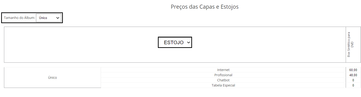 O preço é configurado no menu Módulos > Fotolivros > Preços > Capa e Estojos. Escolha o tamanho e mude a aba para “Estojo”.