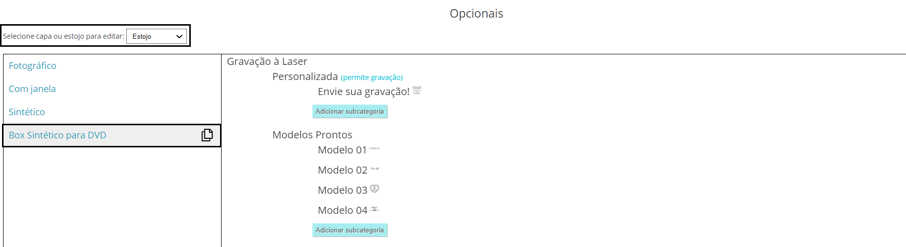 Para cadastrar os opcionais, na tela Módulos > Fotolivros > Sessões de Capas Estojos e Miolos, utilize a aba “Estojo”: