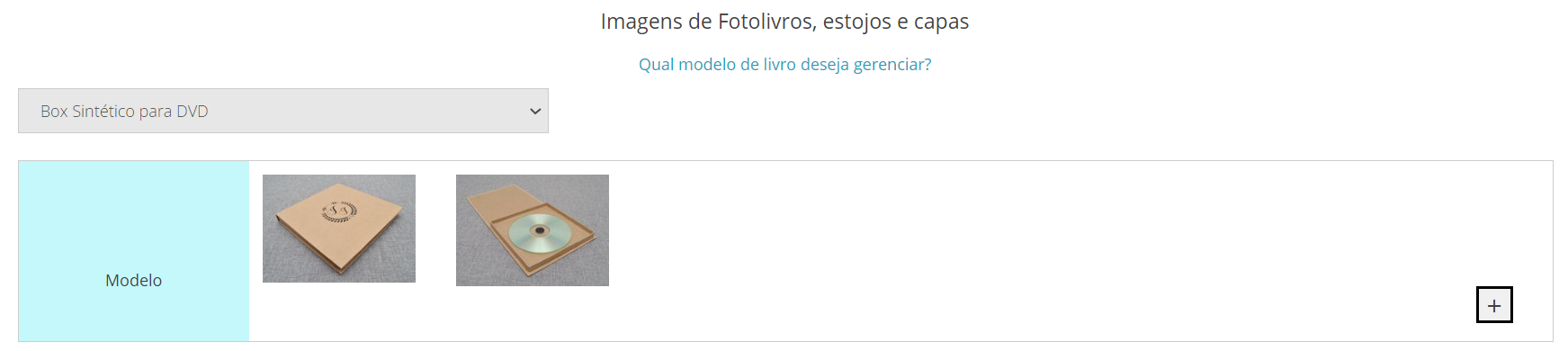 Para inserir as imagens desse modelo, acesse Módulos > Fotolivros > Imagens, escolha o novo modelo e clique no + do campo “Modelo do álbum”: