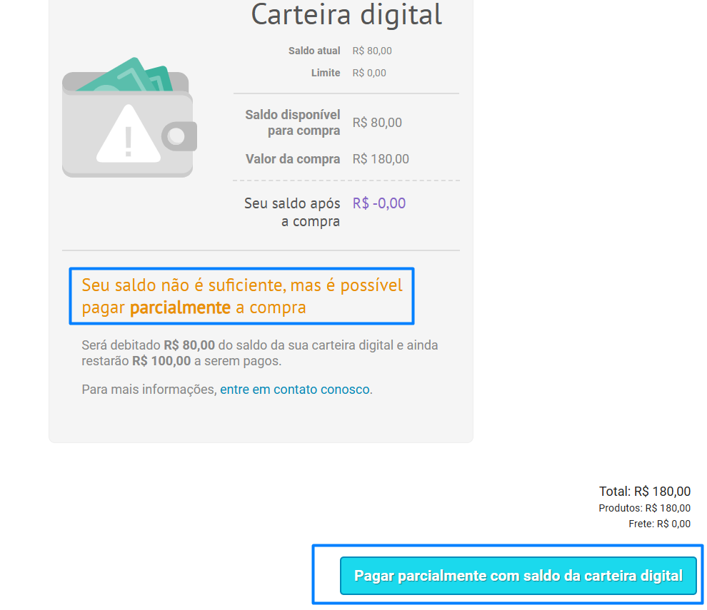 Se o saldo atual da Carteira Digital (saldo + limite) for menor que o total da compra (com descontos), a compra com Carteira Digital Híbrida é permitida.