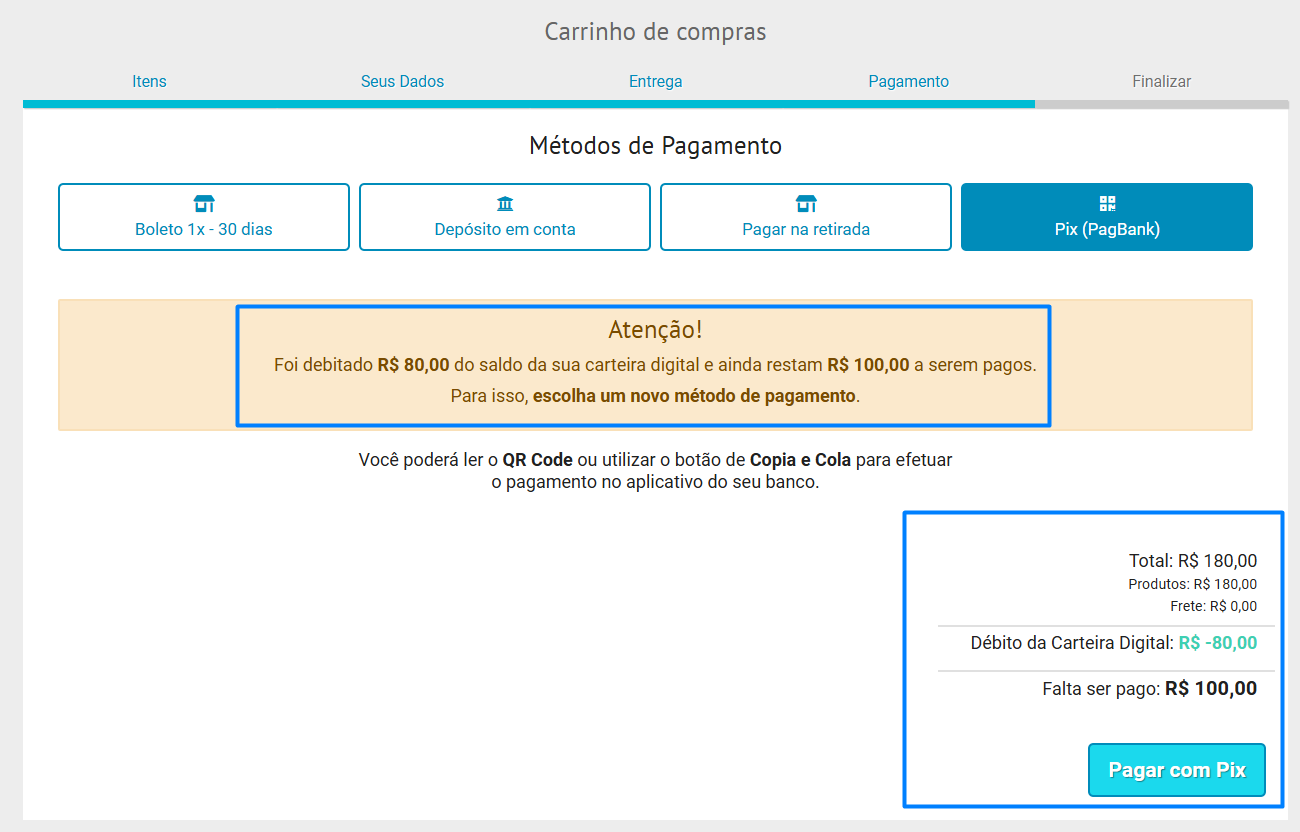 Com o funcionamento atualizado da Carteira Digital Híbrida, agora é possível dividir o pagamento entre o saldo disponível na carteira e um segundo método de pagamento, caso o saldo da carteira não seja suficiente para completar a compra.