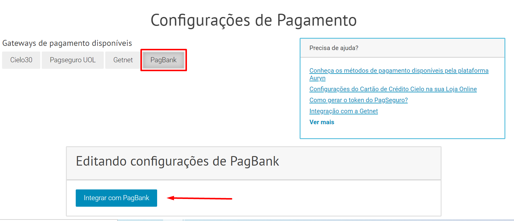 Entre em contato com o nosso suporte através do chat ou do e-mail suporte@auryn.com.br e solicite a liberação dos métodos de pagamento desejados, que podem ser: Pix, Cartão de Crédito e Boleto, se você não solicitar ao suporte, o campo de liberação para a integração com o Pagbank não ficará disponível para você.