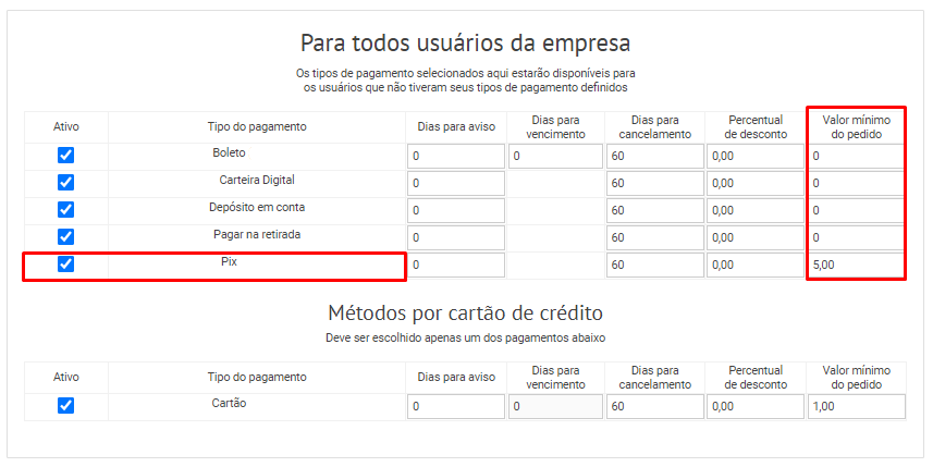 Lembre-se de colocar um valor mínimo para Pix, no pedido para as opções que escolher, caso não seja inserido um valor mínimo, essas opções não ficarão disponíveis para os clientes na plataforma, e aparecerá um "erro" para o cliente na hora do pagamento.