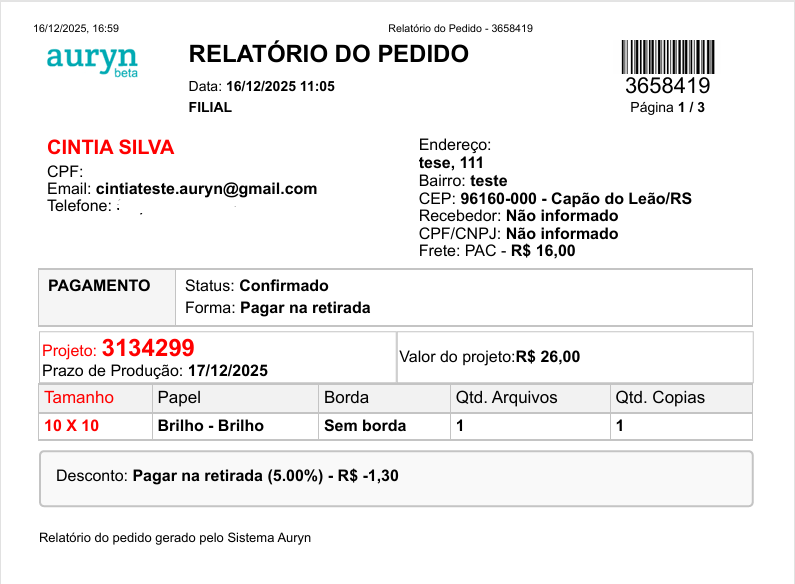 Veja como você receberá o "Novo Relatório de Pedidos para pedidos de Revelação de Fotos", a proposta é que você tenha as informações completas do pedido para visualizar e imprimir em uma única página.
