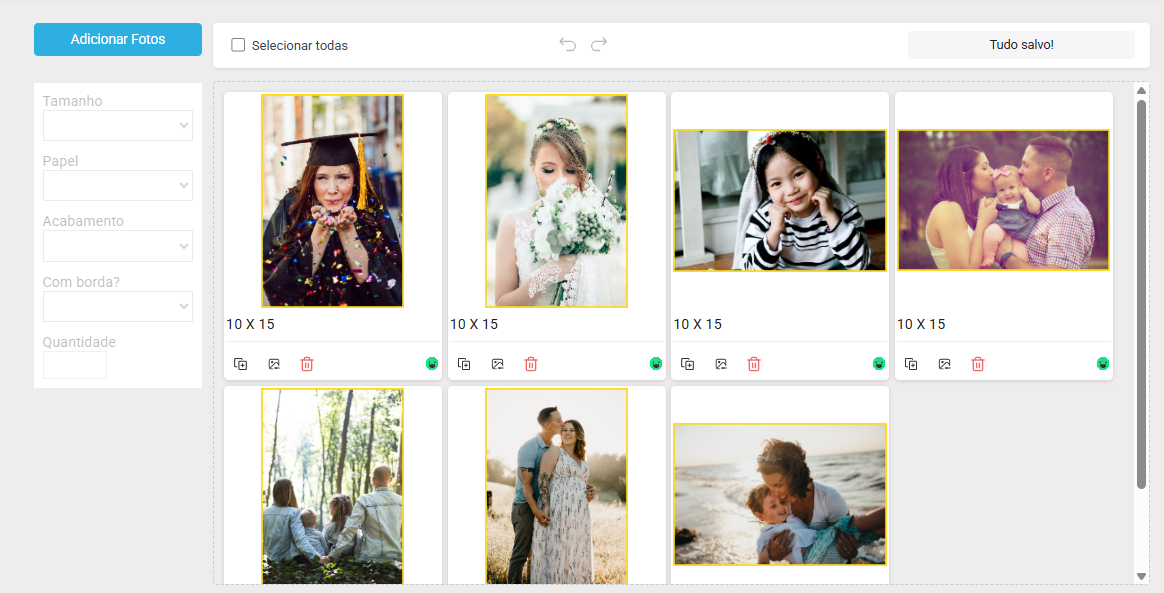 Se houver fotos com configurações diferentes (como tamanho, papel ou borda), o sistema cria uma nova linha dentro da mesma etiqueta.