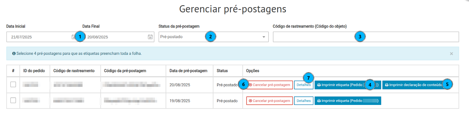 Organize as pré-postagens conforme seu status atual (ex.: pendente, enviada, cancelada).Buscar por Código de Rastreamento