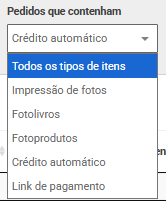 Itens específicos | Permite filtrar pedidos que contenham itens específicos, como apenas Fotolivros, produto ou apenas Impressão de Fotos. |