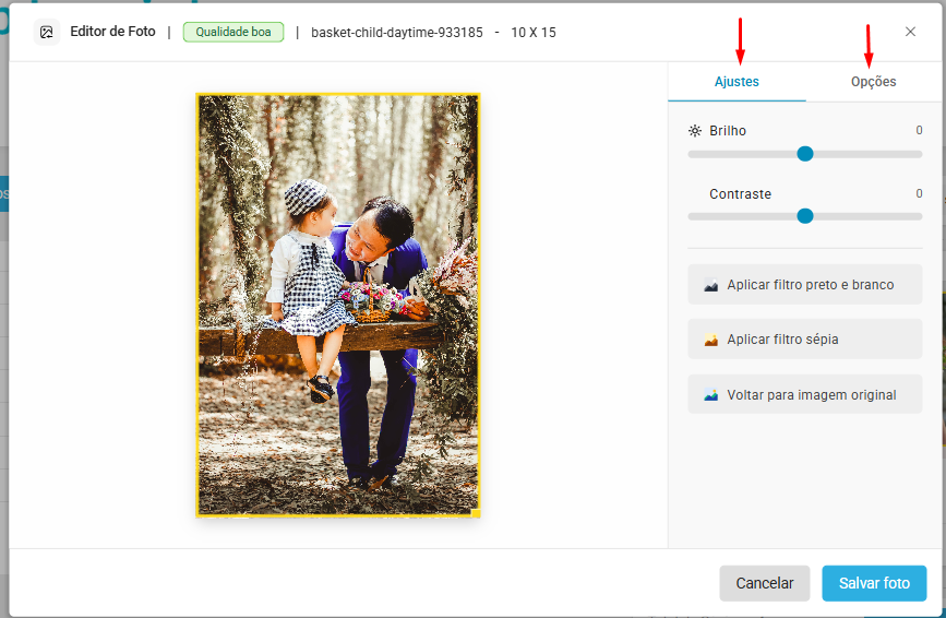 - Na opção "Ajustes", altere: brilho, contraste, aplicar o filtro na imagem ou voltar para a imagem original, caso tenha mudado algo.