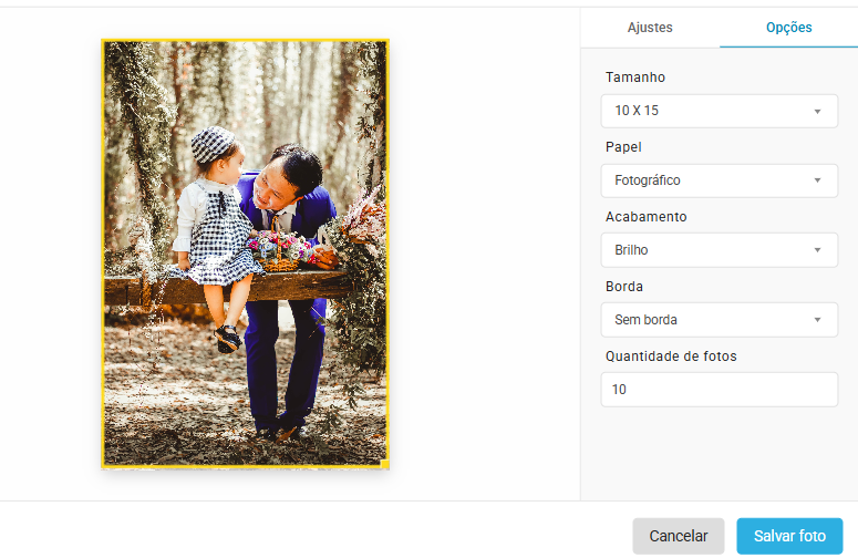 - Em "Opções" altere: Tamanho, Papel, Acabamento, Borda, quantidade de cópias.