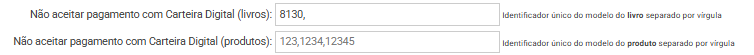 Informe o ID único do modelo do livro, separado por vírgula, caso haja mais de um. - Não aceitar pagamento com Carteira Digital (produtos)