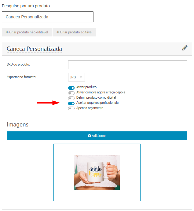 Para ativar, o lojista deve acessar a configuração do fotoproduto e habilitar a opção “Aceitar arquivos profissionais”. Após isso, o botão “Enviar arte pronta” ficará disponível na loja.