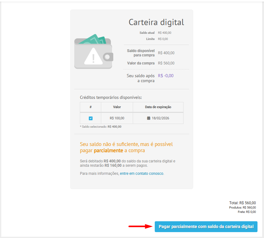 Com essa atualização, você tem uma visualização mais rápida e clara de quanto foi pago via carteira digital e quanto ainda falta para finalizar o pedido.