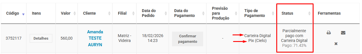 Percentual pago via Carteira Digital exibido na tela de Pedidos