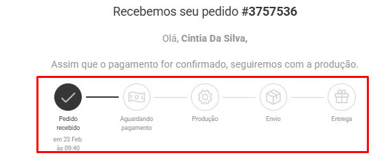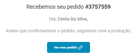 Ocultar o passo a passo do pedido no layout do e-mail: esconde a barra visual com as etapas do pedido (Criação, Pagamento, Produção, etc.), deixando o e-mail mais simples e alinhado ao padrão da loja.