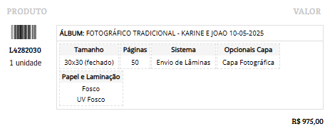 Com essa melhoria, é possível destacar itens complementares no momento da finalização do pedido, incentivando o cliente a incluir mais produtos de forma prática e natural — como álbuns, quadros e porta-retratos.