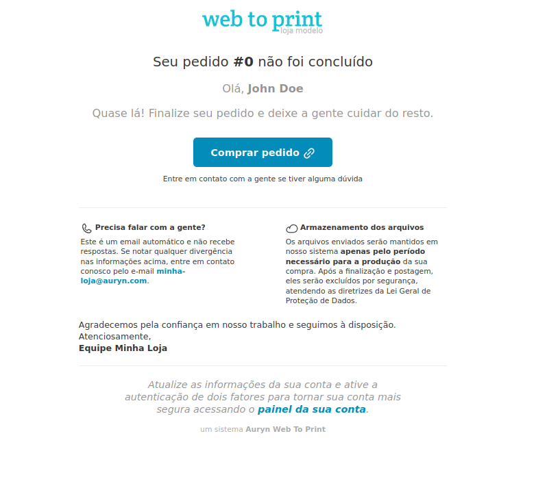 Este e-mail é disparado quando o status do pedido é alterado para “Terminar”.