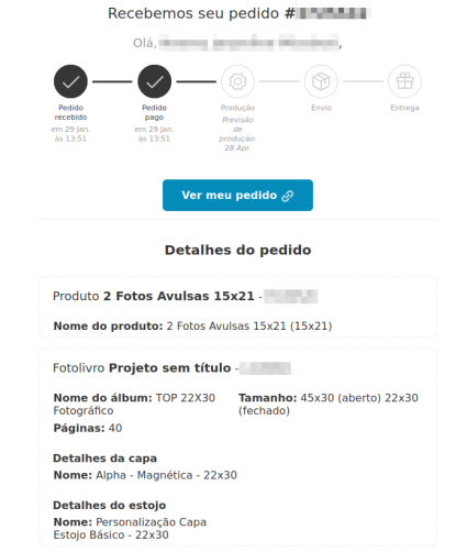 Estando tudo certo, seguiremos com a produção e você receberá seu pedido no prazo informado.