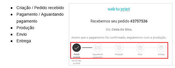 Ao ativar essa opção, o sistema oculta o passo a passo visual do status do pedido no layout dos e-mails, conforme mostra a imagem abaixo: