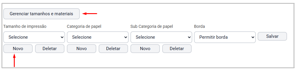 Para cadastrar novos padrões de impressão, clique em Gerenciar Tamanhos e Materiais.
