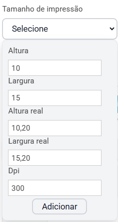 Exemplo: ao informar altura 10 e largura 15, o tamanho será exibido como 10x15. - Altura e largura real