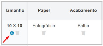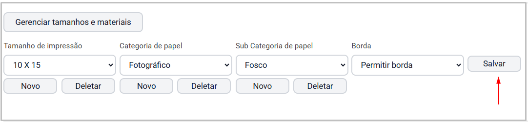 Após o preenchimento, o tamanho ficará disponível para configuração de papel, acabamento e borda. Clique em Salvar para criar o novo tamanho.