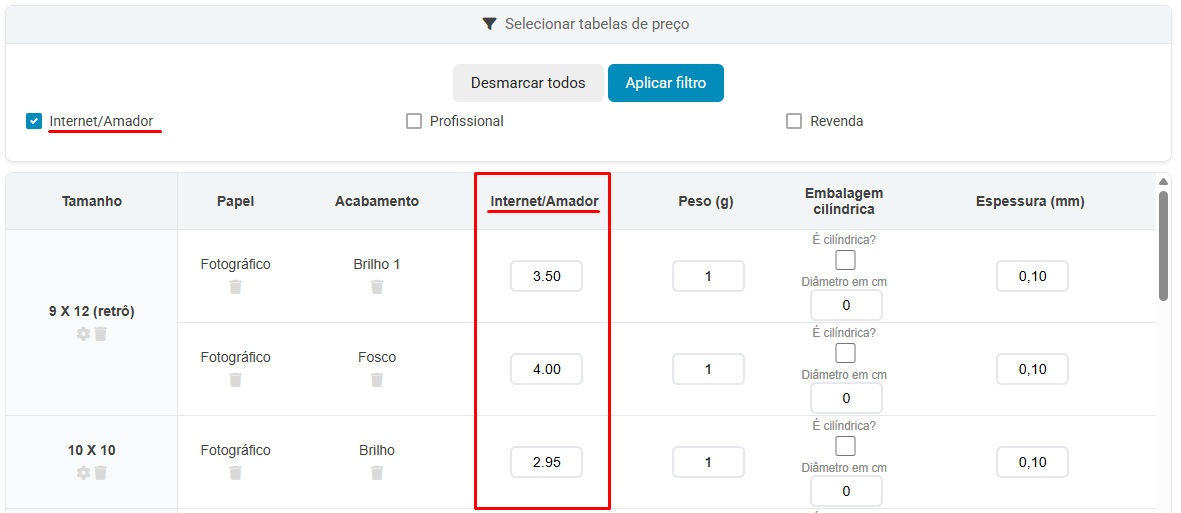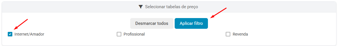 Você pode escolher qual tabela deseja visualizar (Internet/Amador, Profissional ou Revenda, por exemplo). Isso ajuda a focar somente nos preços que você pretende alterar.