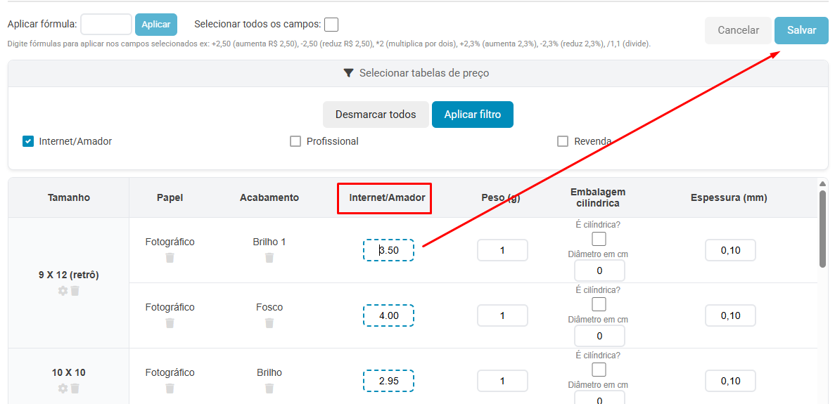 Você pode alterar os preços desejados manualmente, aplicar as fórmulas, e clicar em "salvar":