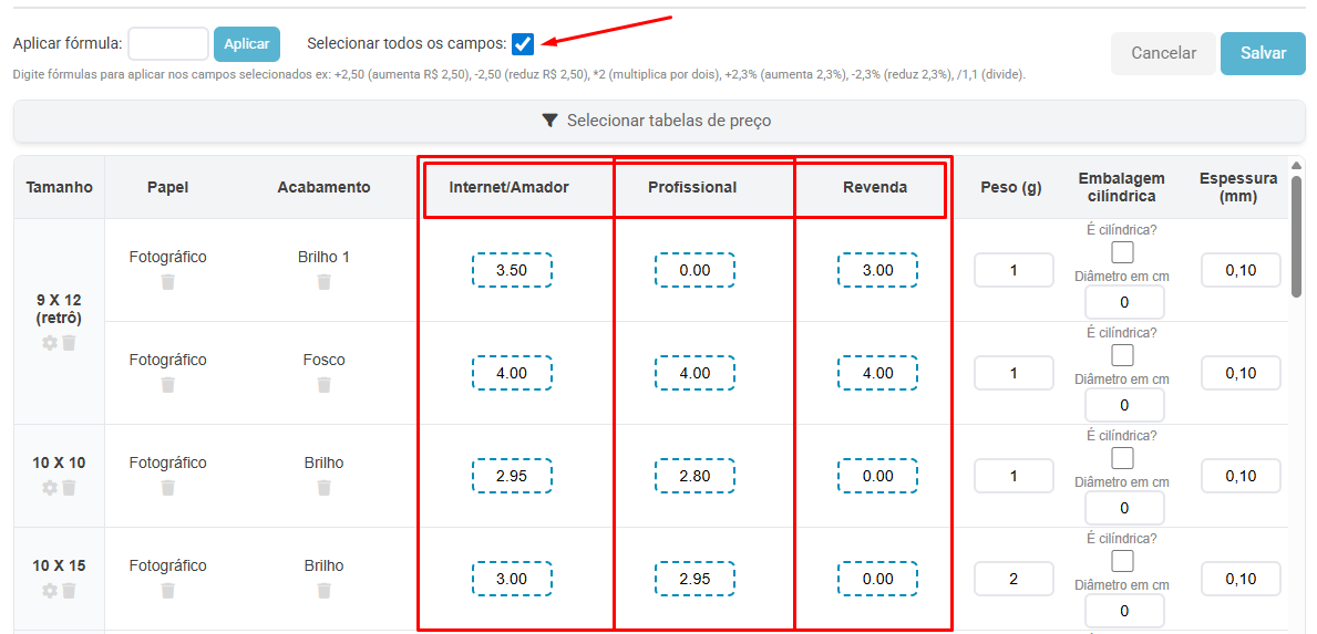 Você pode atualizar os valores de todas as tabelas de preço ao mesmo tempo (Internet/Amador Profissional, Revenda etc.), pode usar a função "Selecionar todos os campos", sem precisar editar tabela por tabela.