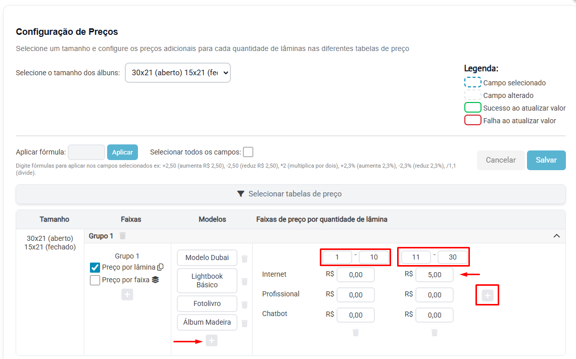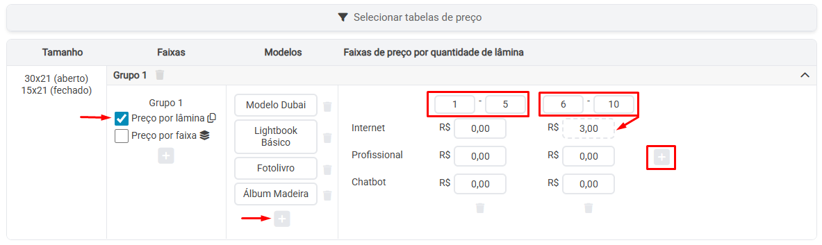 A configuração é realizada por tamanho de álbum e organizada em grupos de faixas, que permitem reutilizar a mesma regra de preço para diferentes modelos de álbum.