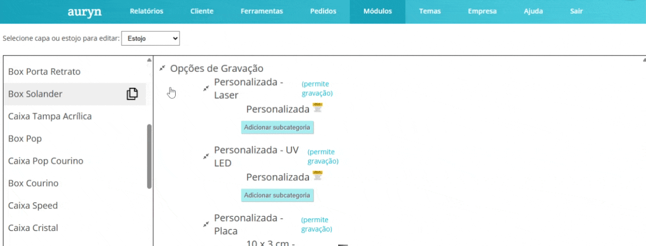 É onde o preço do opcional deve ser definido (ex.: Tons Claros).Subcategoria - Não possui preço.