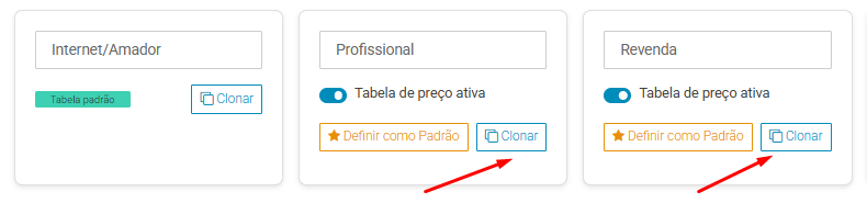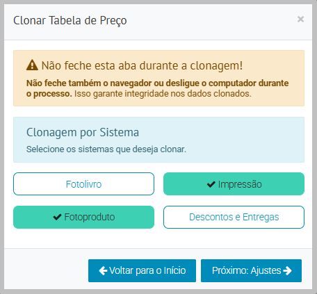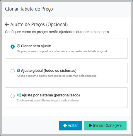 Em seguida você pode escolher quais módulos/sistema, deseja clonar os preços: