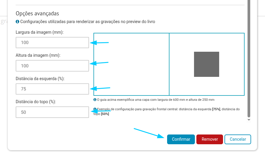 - O tamanho da gravação nas caixas laterais (em milímetros) e a posição que ocupará na capa (a altura do texto será conforme a especificação de Altura da imagem);