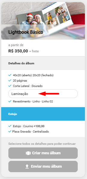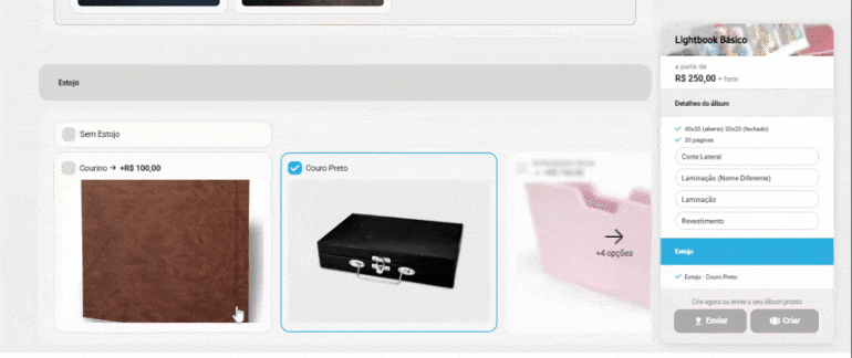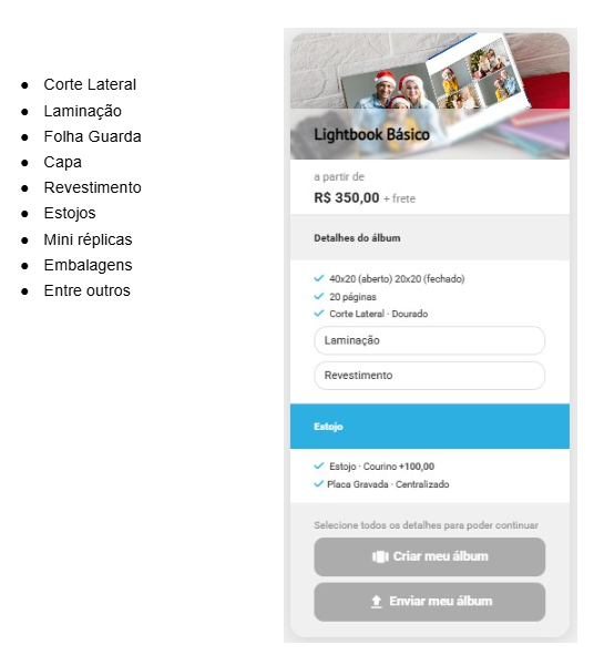 No lado esquerdo da tela, ficam todos os opcionais disponíveis do álbum cadastrado, organizados por categorias, como, por exemplo: