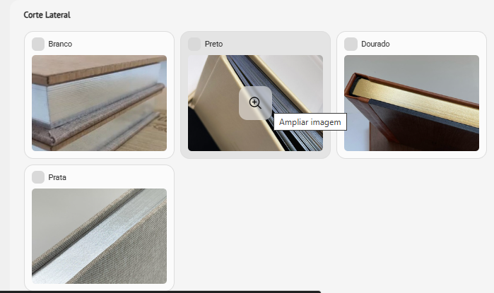 - Imagem dos opcionais de folhas internas, capa e estojo