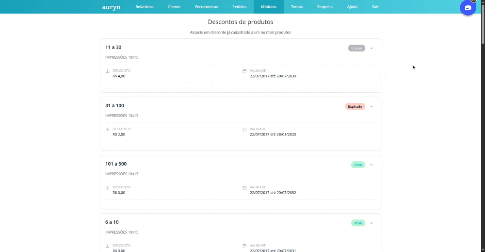 Impressões → para vincular descontos a tamanhos de impressão.