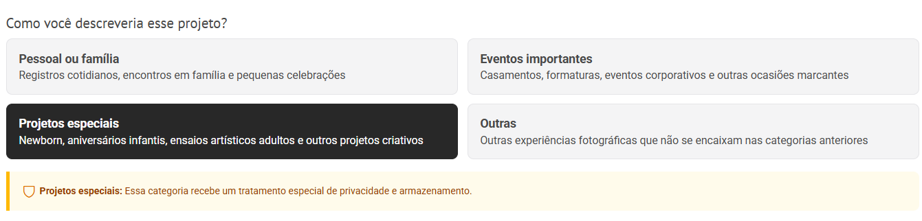 ➡️ Ao selecionar a opção “Projetos Especiais”, essa categoria recebe um tratamento especial de privacidade e armazenamento.